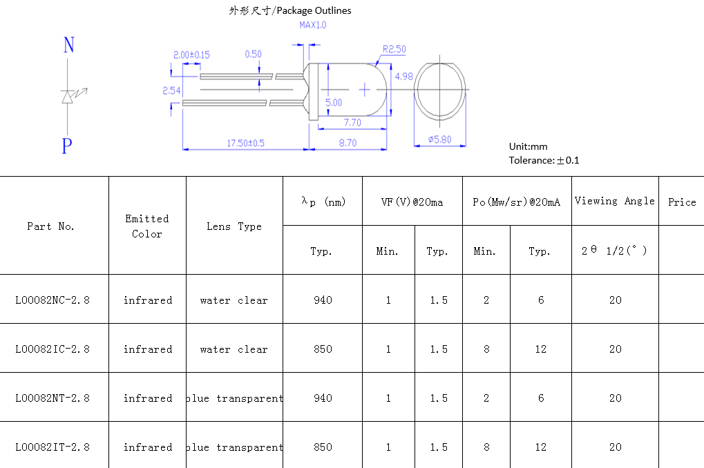 5mm 紅外發(fā)射管。特征:紅外輸出功率高,響應(yīng)速度快。應(yīng)用:高速紅外通信,光學(xué)開關(guān),光電傳感器,攝像頭,煙霧傳感器
