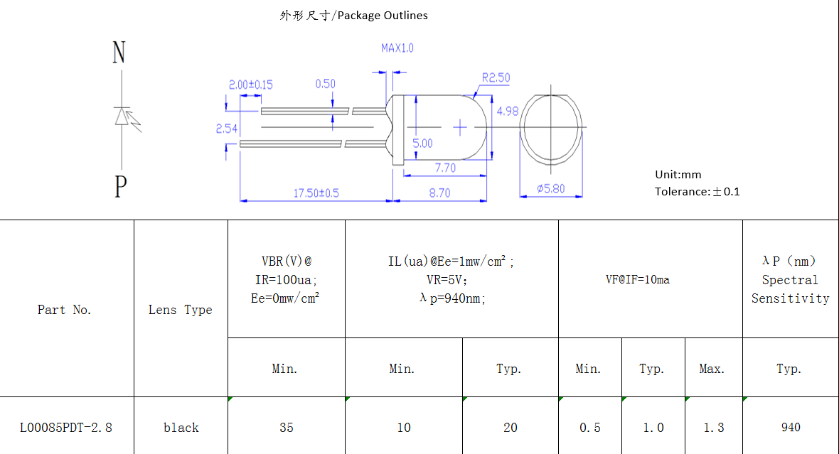 f5紅外接收管。特征:紅外輸出功率高,響應(yīng)速度快。應(yīng)用:高速紅外通信,光學(xué)開關(guān),光電傳感器,攝像頭,煙霧傳感器