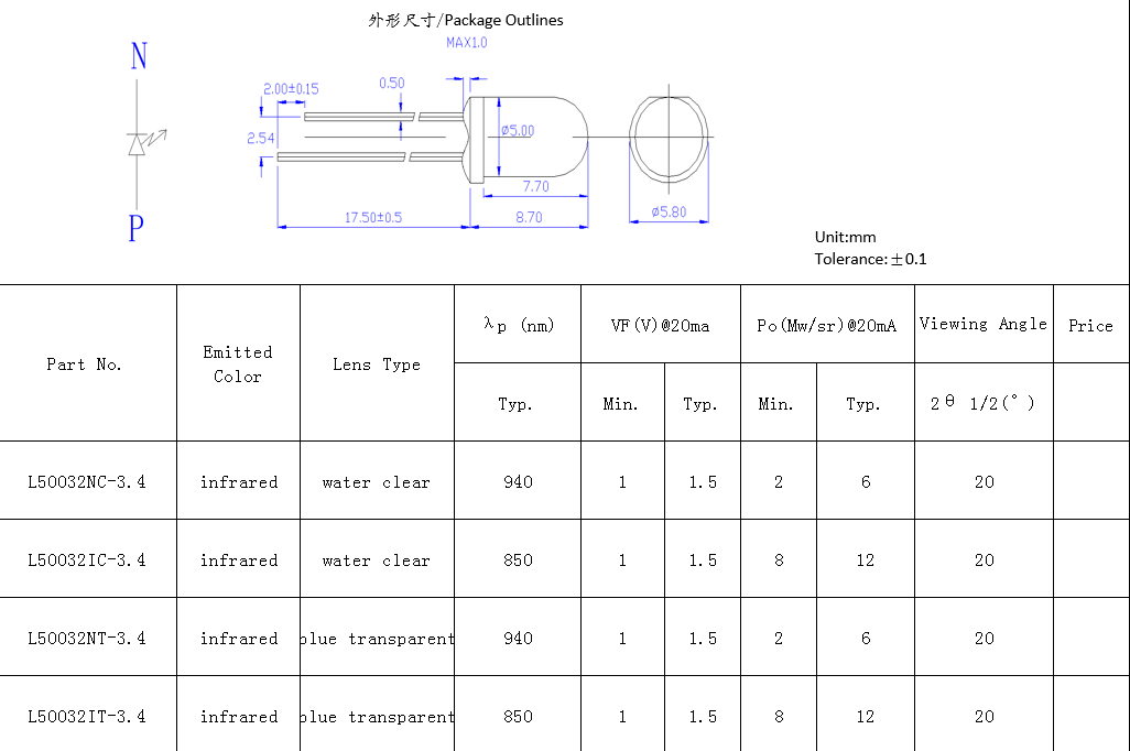 5mm 紅外發(fā)射管。特征:紅外輸出功率高,響應(yīng)速度快。應(yīng)用:高速紅外通信,光學(xué)開關(guān),光電傳感器,攝像頭,煙霧傳感器