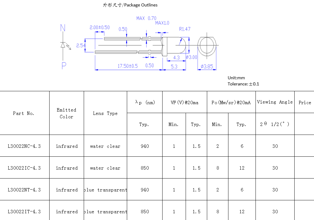 3mm 紅外發(fā)射管。特征:紅外輸出功率高,響應(yīng)速度快。應(yīng)用:高速紅外通信,光學(xué)開(kāi)關(guān),光電傳感器,攝像頭,煙霧傳感器