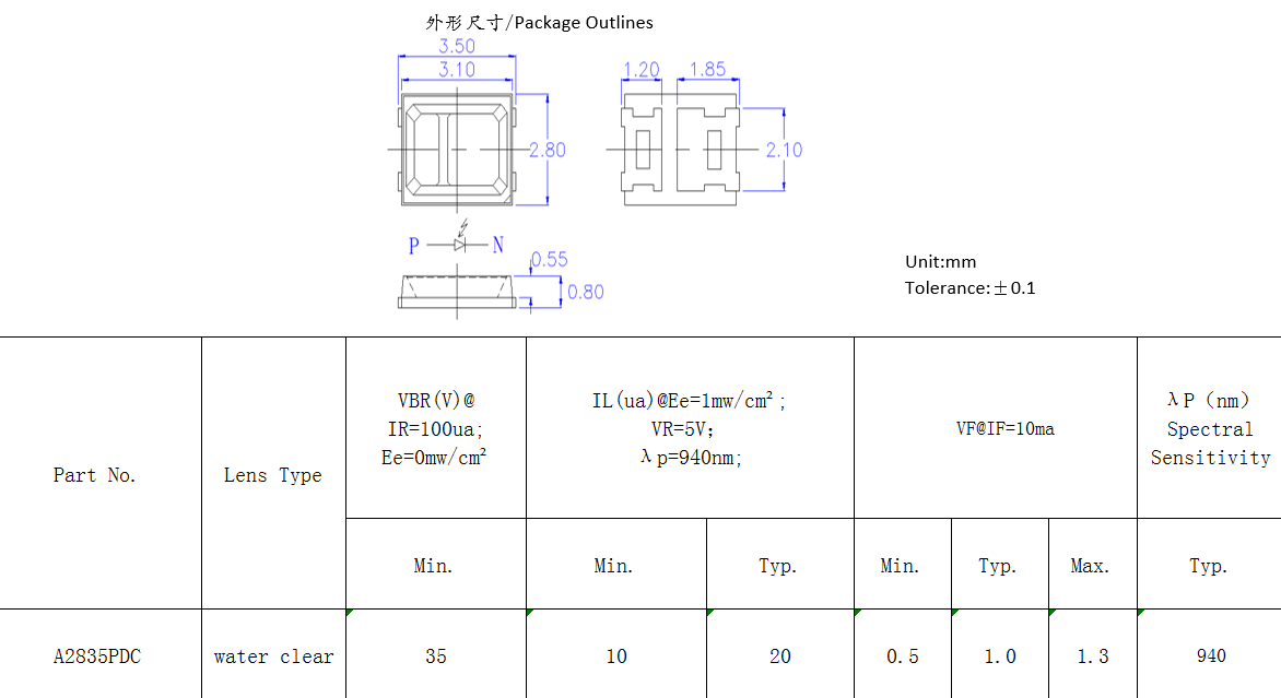 貼片紅外接收管。特征:紅外輸出功率高,響應(yīng)速度快。應(yīng)用:高速紅外通信,光學(xué)開關(guān),光電傳感器,攝像頭,煙霧傳感器