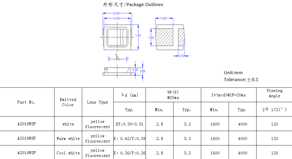 2.0mm(長)*1.6mm(寬)*0.55mm(厚) 特征:低光衰,低能耗。應用:裝飾照明,家居照明,背光燈,按鍵指示