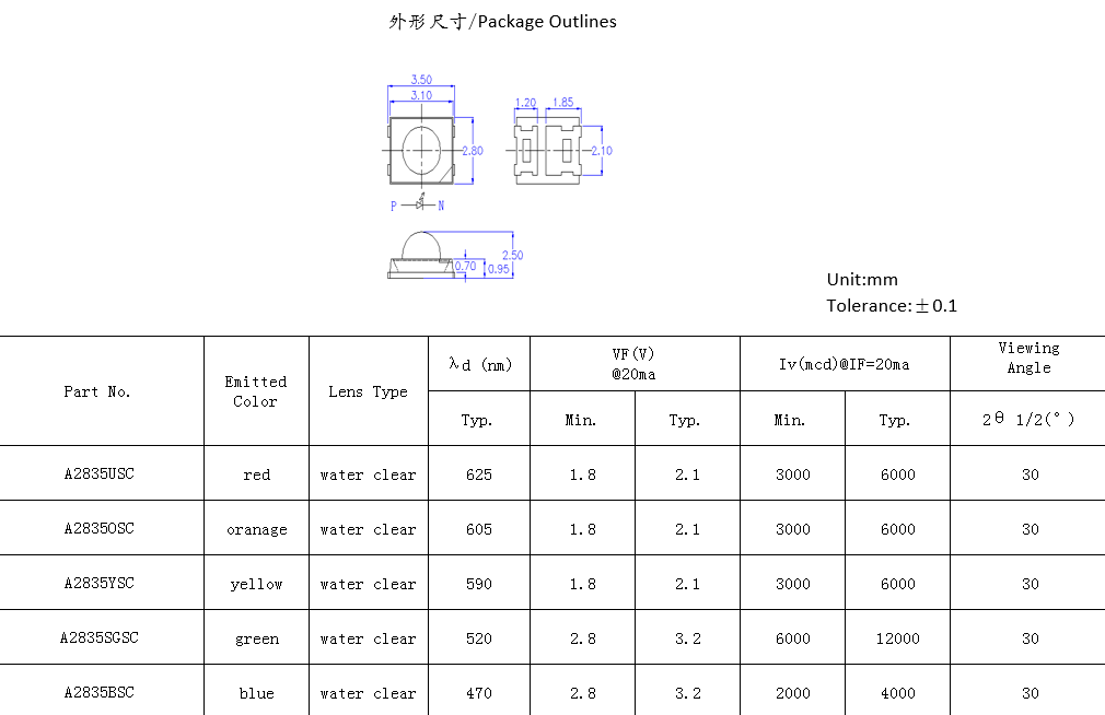 2.8mm(長(zhǎng))*3.5mm(寬)*2.5mm(厚) 特征:低光衰,低能耗。應(yīng)用:裝飾照明,家居照明,背光燈,按鍵指示