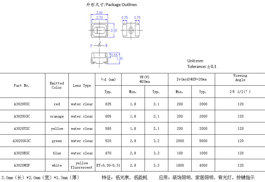 3.0mm(長)*2.0mm(寬)*1.3mm(厚) 特征:低光衰,低能耗。應用:裝飾照明,家居照明,背光燈,按鍵指示