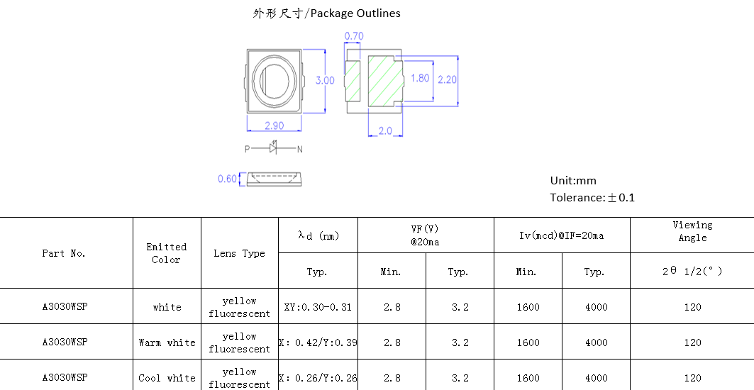 3.0mm(長)*3.0mm(寬)*0.6mm(厚) 特征:低光衰,低能耗。應用:裝飾照明,家居照明,背光燈,按鍵指示