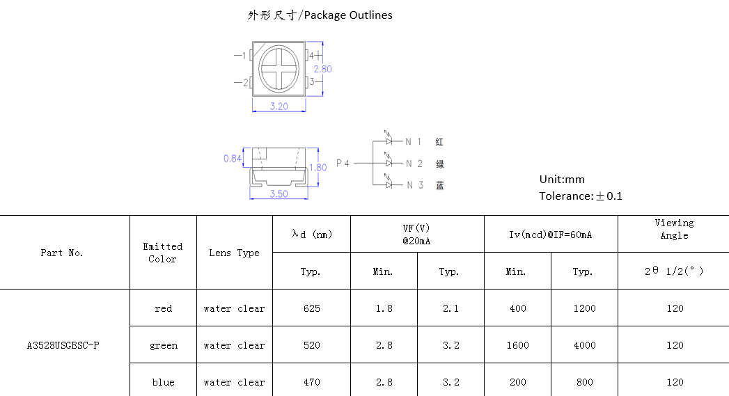 3.5mm(長)*2.8mm(寬)*1.8mm(厚)特征:低光衰,低能耗。應(yīng)用:裝飾照明,家居照明,背光燈,按鍵指示